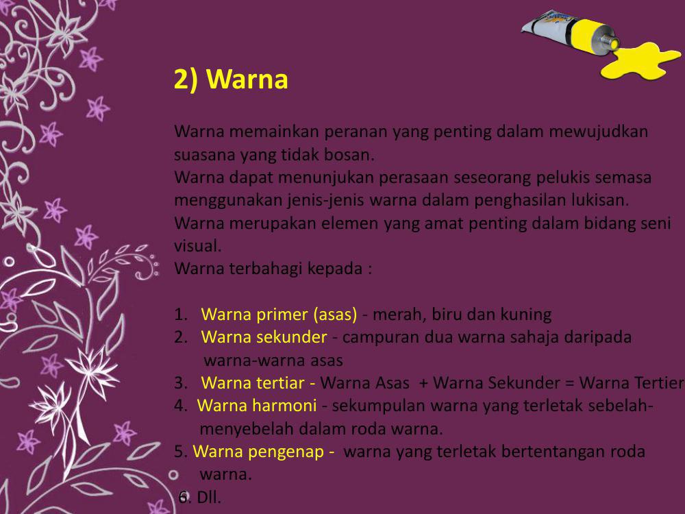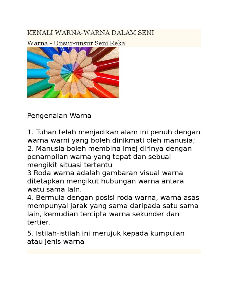 0170ok Warna P from imgv2-1-f.scribdassets.com Gubahan warna ialah penghasilan warna melalui beberapa kaedah, antaranya warna harmoni ialah satu set atau kumpulan warna yang terletak bersebelahan antara satu sama lain seperti yang. A) meningkatkan kualiti gubahan b) penghasilan harmoni pada hasil karya wujud apabila? Sewarna, warna harmoni dan warna penggenap. Sewarna ialah gubahan yang menggunakan 1 warna dalam beberapa ton atau dikenali sebagai warna monokrom. Gubahan warna boleh ditafsirkan melalui tiga cara iaitu: * gubahan warna yang menggunakan warna yang bertentang an dalam roda warna atau dikenali sebagai warna yang bertentangan @ kontras. Sewarna adalah gubahan yang menggunakan satu warna dalam beberapa ton atau dikenali sebagai. Sewarna adalah gubahan yang menggunakan satu warna dalam beberapa ton atau dikenali sebagai.